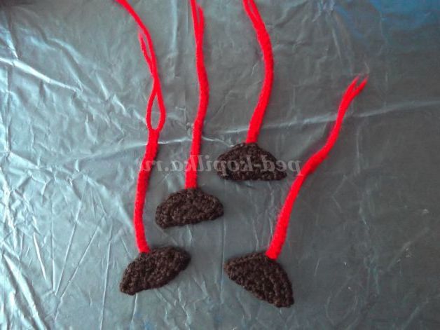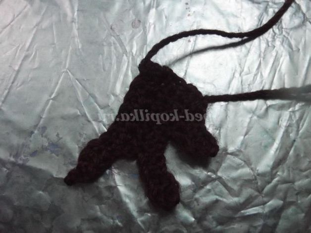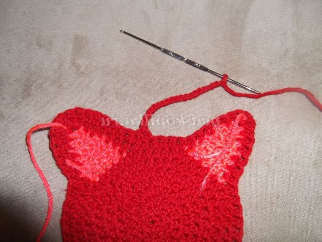 11-й коло: 25 ст.б/н,7 ст.б/н на бічній стороні вуха, 4 ст.б/н в одну петлю (вершина вуха), 7 ст.б/н на бічній стороні вуха, 6 ст. б/н на ділянці між вух, 7 ст.б/н на бічній стороні вуха, 4 ст.б/н в одну петлю (вершина вуха), потім 7 ст.б/н на бічній стороні вуха, 25 ст.б/н, соед.ст.