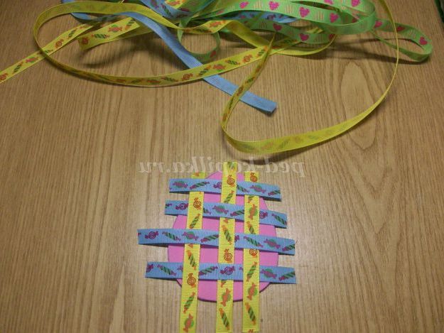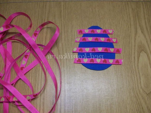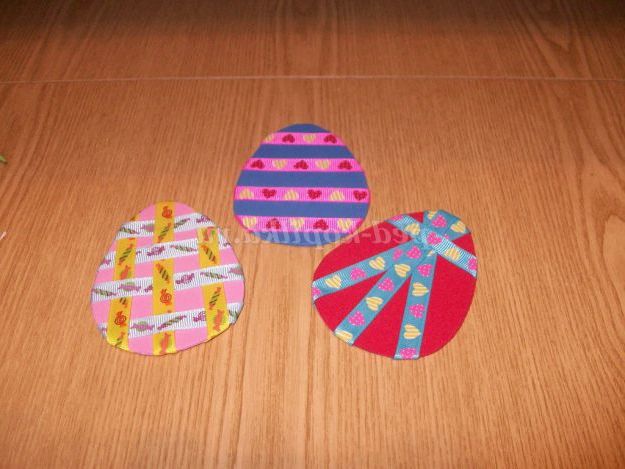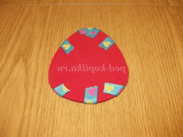 За допомогою двостороннього скотча приклеюємо готові кольорові великодні яйця на середню частину вироби.