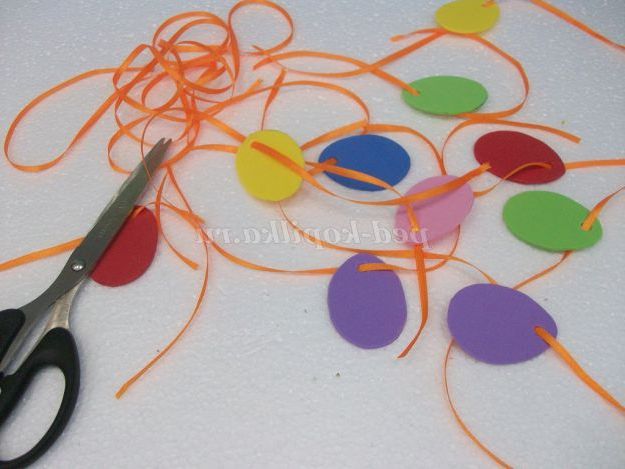 З кольорової декоративної пінки вирізаємо яйця. Робимо отвори за допомогою діркопробивача.