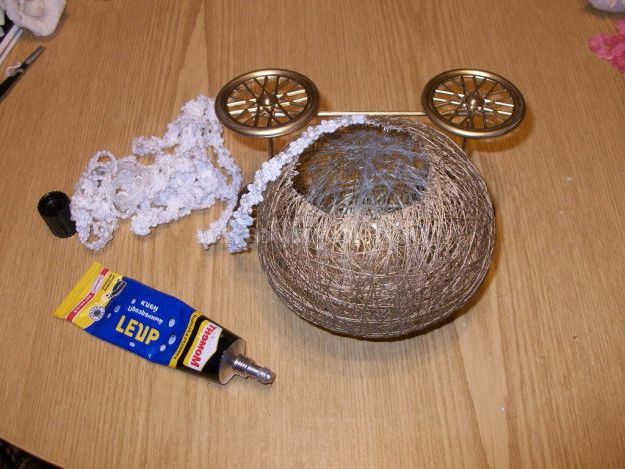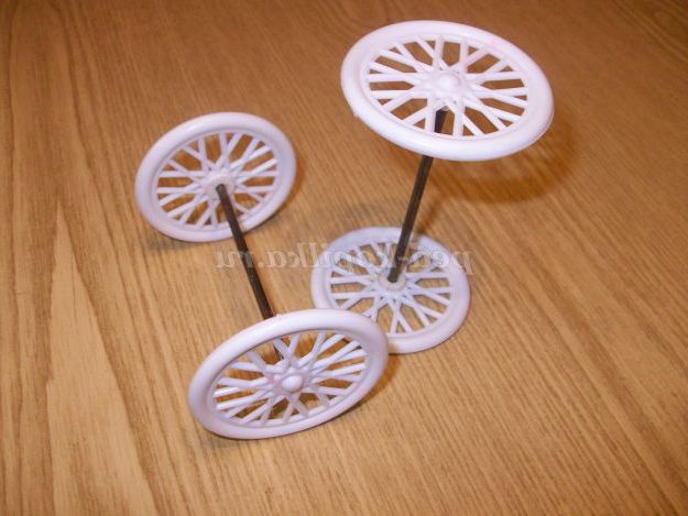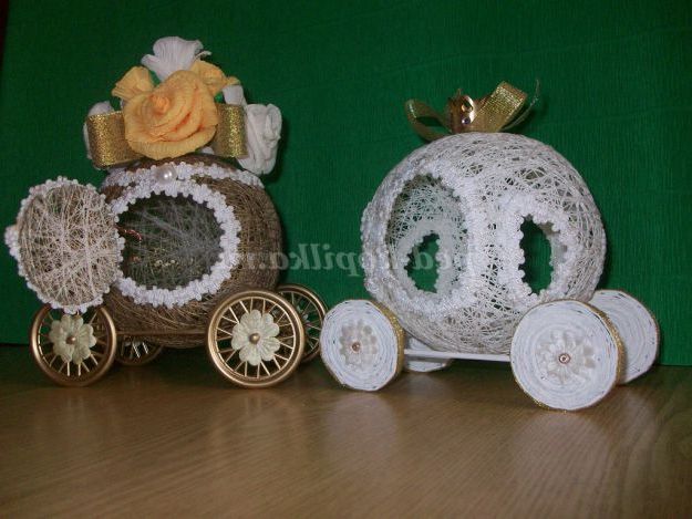1. Колеса для карети можна зробити самим: з газетних трубочок або журналів: смужки шириною 7 см, накручувати на шпажку під кутом в 45 градусів, пофарбувати білою фарбою.