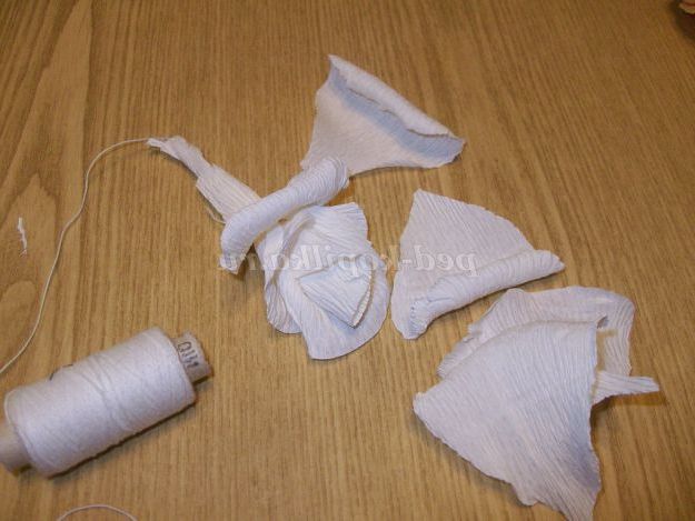 Всі обрізки використовуємо для серцевини квітки. Потім скручуємо пелюстки туго за допомогою ниток, щоб квітка не зруйнувався.