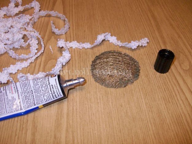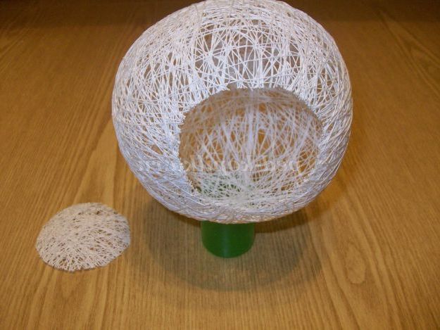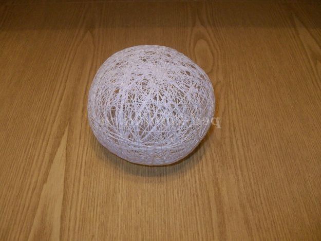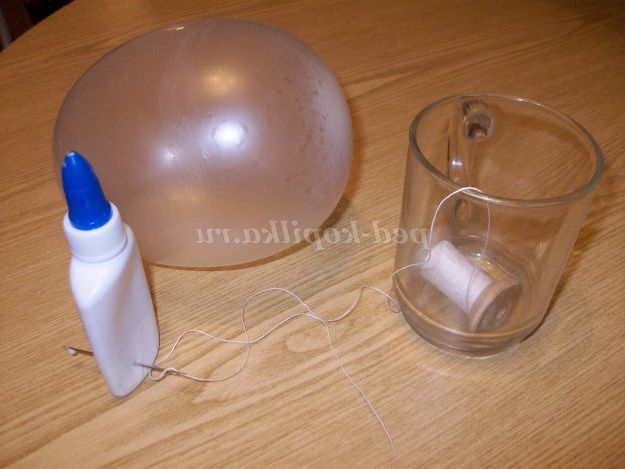 Надуваємо кульку з напальчника розміром приблизно 11 см добре зав'язуємо, кінець нитки залишаємо. Беремо котушку ниток білого кольору, поміщаємо в прозору кухоль, щоб полегшити намотування. А протягуємо кінець нитки в голку, проколюємо тюбик з клеєм знизу, зручніше працювати. Видавлюємо трохи клею, для кращого намокання нитки.