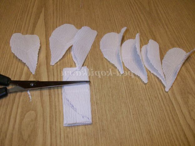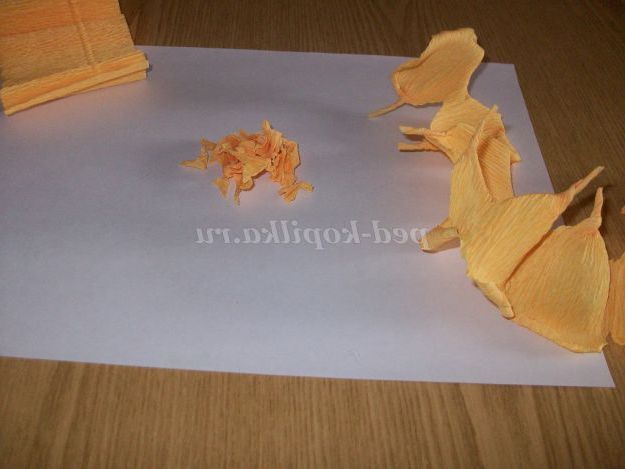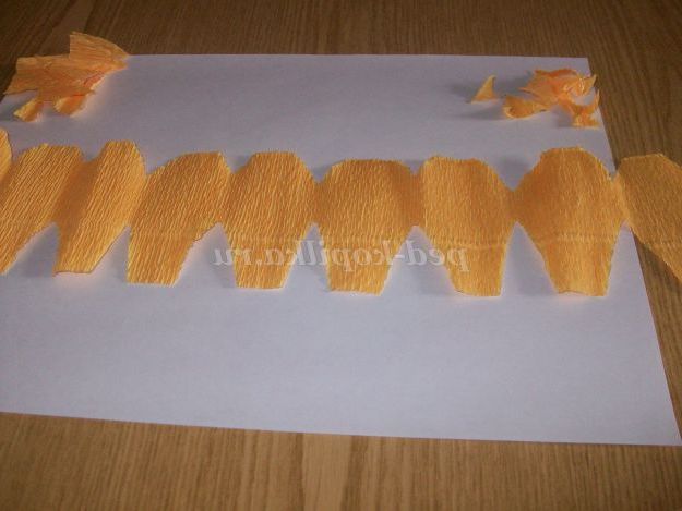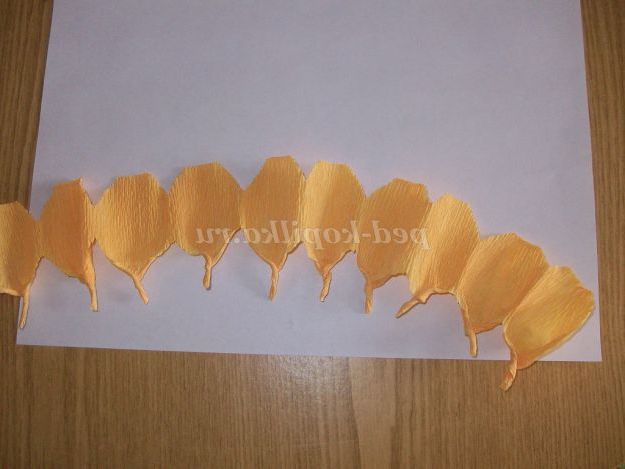 Робимо квіти білого і жовтого кольору. Гофрований папір складемо гармошкою на 7 - 9 пелюсток (кожен шар-пелюстка) шириною 2,5 див Відрізаємо висотою 6 див.