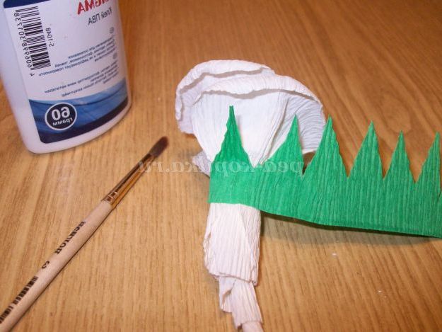 З гофрованого паперу зеленого кольору вирізаємо парканчик, для майбутніх чашолистків. Обклеюємо бутон квітки.