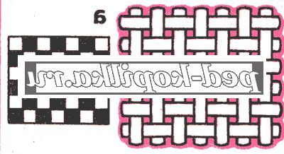 4. Будь-яка тканина складається з взаємно перпендикулярних переплетених ниток основи і качка. Послідовність, в якій переплітаються нитки, створює той чи інший малюнок переплетення ниток в тканині. У нашому випадку нитками будуть служити стрічки. Ви можете вибрати будь переплетення на свій смак (а. полотняне переплетення, б. саржеве переплетення, ст. сатинове переплетення).