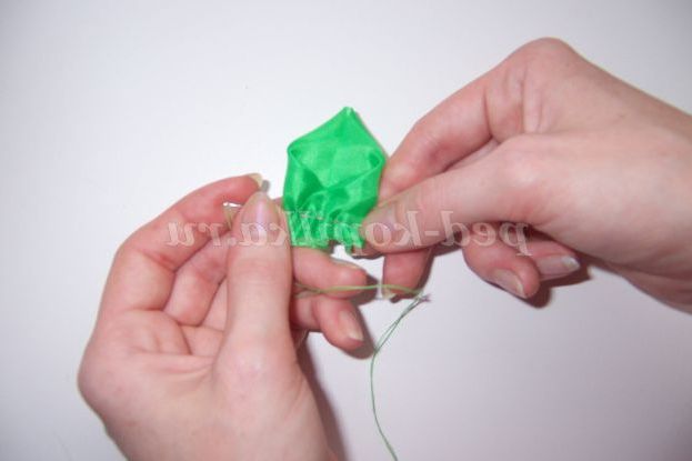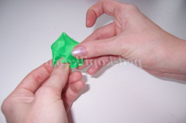 Для цього нам знадобиться 3 деталі зеленої атласної стрічки. Деталь беремо в руки виворотом вгору і утворимо трикутник, загинаючи верхні кути деталі до центру встик один одного, потім нижні кути підгинаємо до центру, накладаючи один на одного.