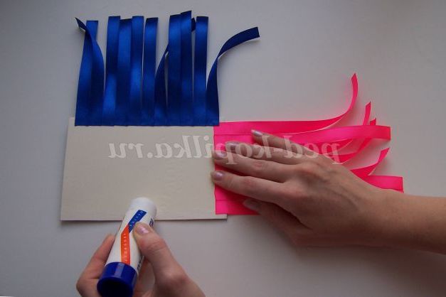 2. На основу з картону приклеюємо стрічки лицьовими сторонами вгору, встик один одному, відступивши від країв 0,5 см, праворуч йдуть рожеві стрічки, зверху сині.