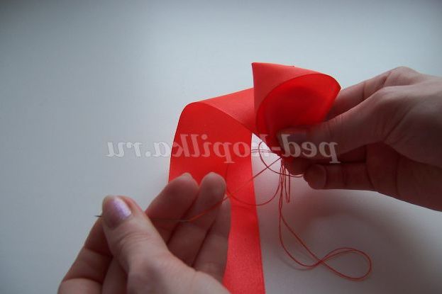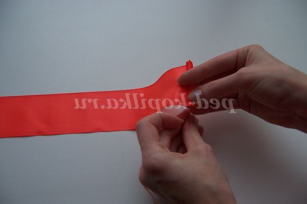 Для цього нам знадобляться нитки, голка, ножиці, атласні стрічки трьох кольорів шириною 5 см завдовжки 50 див. підпалені з країв.