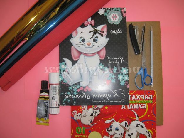 синього і жовтого кольору, самоклеюча оксамитова папір (коричнева, чорна, блакитна, жовта, червона, зелена, біла, синя)золотиста тасьма, ножиці, олівець,клей-олівець, клей момент, чорний маркер, степлер.