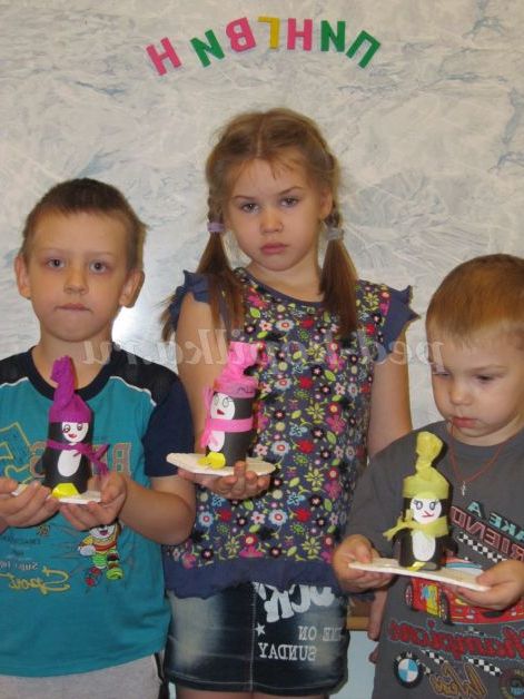Малюємо деталі особи. Фломастерами промальовуємо очі, вії, дзьоб (прояв фантазії: за бажанням дитини, батьків, педагогів можна намалювати щічки, рум'янець, запропонувати дітям придумати імена пингвинчикам, як-небудь їх назвати і т.д.)
