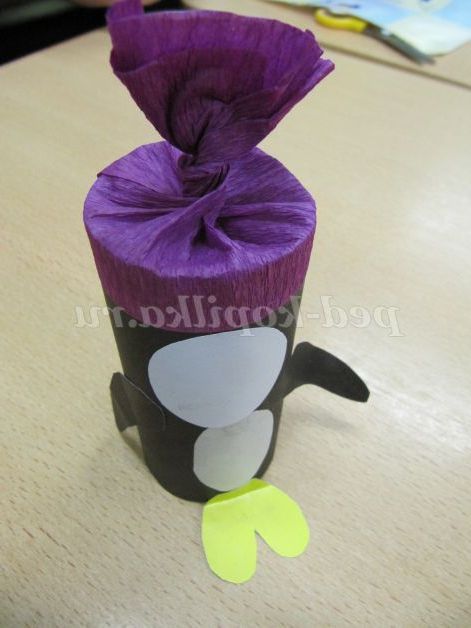 Вам буде потрібно: викидний матеріал (гільза від туалетного паперу), ножиці, кольоровий папір (чорна, жовта, біла, креповая), склеювальний олівець, фломастери.
