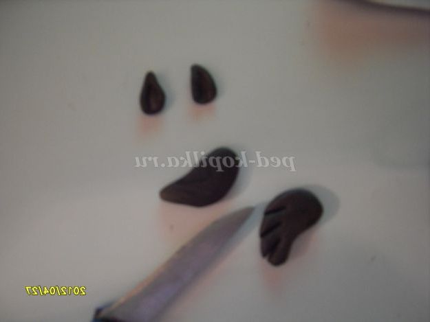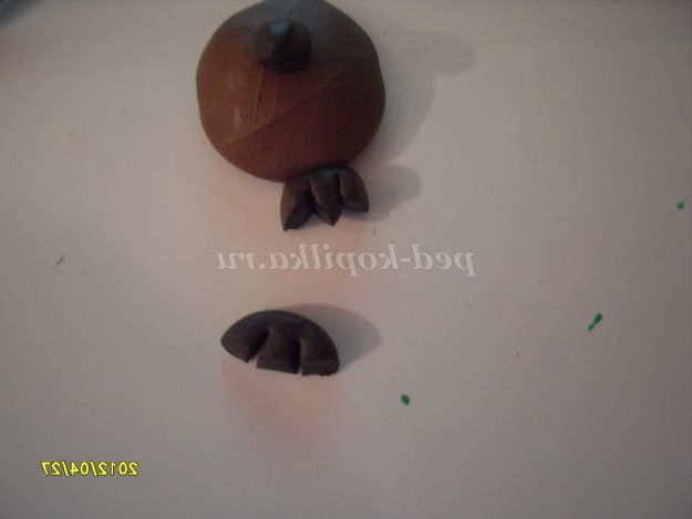 4. Відщипуємо невеликий шматочок і прокатуємо його між долонями, формуючи краплю. З якої згодом вылепляем дзьоб.