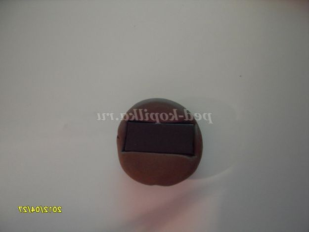2. Розкачуємо з великого шматка кулю і приплющиваем його (у формі випуклої коржі) до магніту. Магніт можна приклеїти на клей, після випалу.