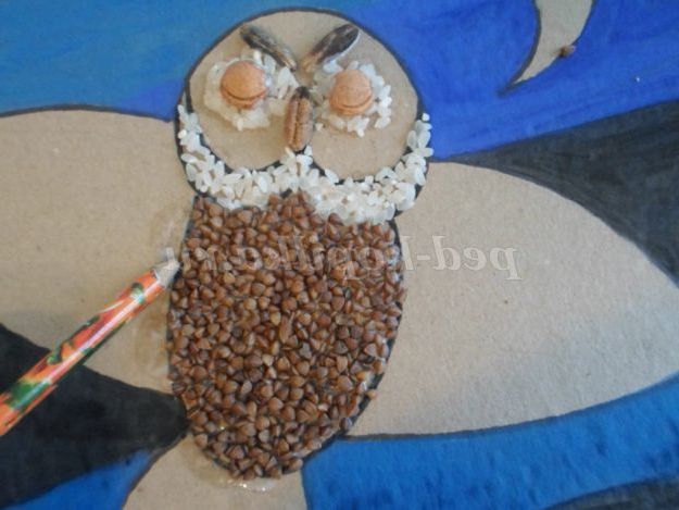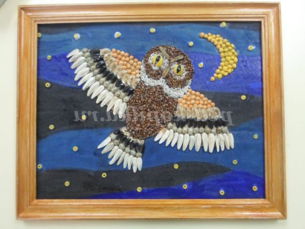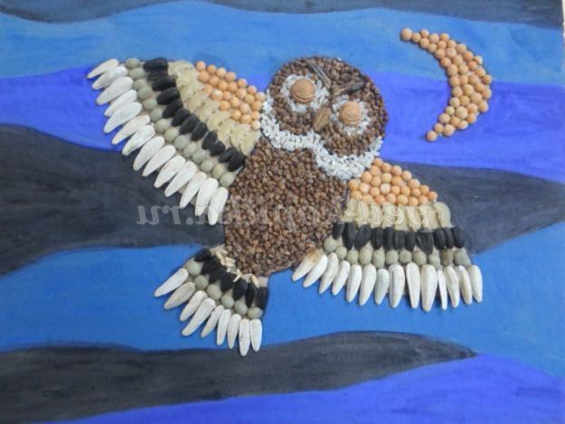 Нанести клей на крила і викласти їх за своїм бажанням. Ми використовували білі та чорні насіння, горох, зелена кава, макарони.