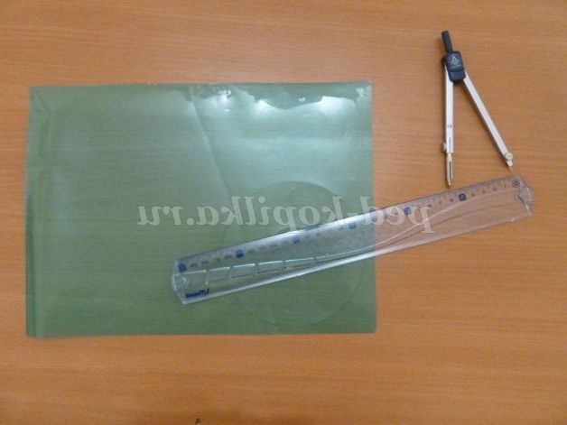 2.ЗА допомогою лінійки і циркуля накреслимо на одній стороні папки-куточка 5 кіл. Розміри: перше коло R-6см; друге коло R-5см; третє коло R-4см; четвертий коло R-3см; п'ятий коло R-2см.