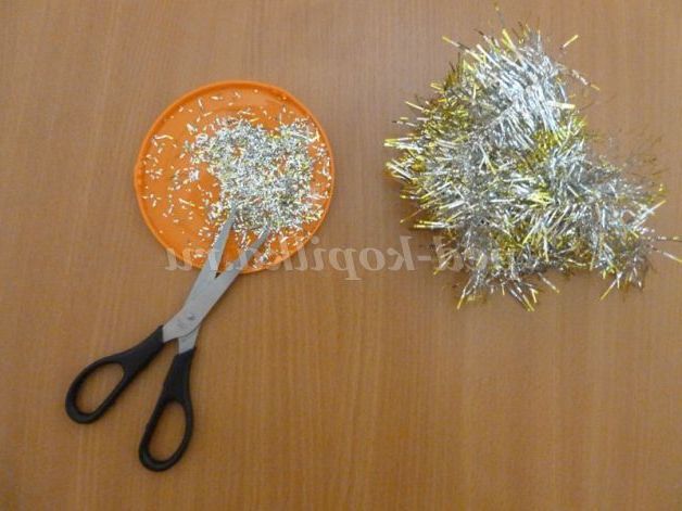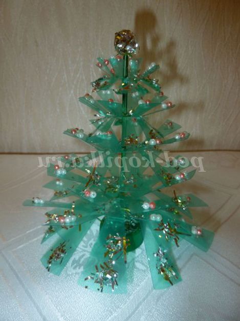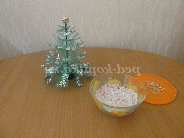 9.Отломим шпажку за розміром ялинки. Використовуючи бісер, дрібно нарізану мішуру, гудзик і клей довільно прикрашаємо ялинку. Можна прикріпити до ялинки нитку - вийде ялинкову прикрасу. Моя ялинка стоїть на пробці від пластикової пляшки (в кришці зроблена дірочка під стовбур).