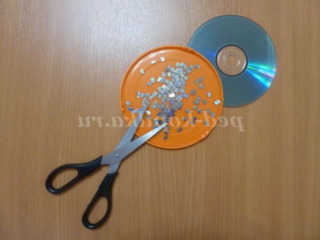 2.Нарежем полотно CD диска довільно на невеликі квадратики, трикутники, прямокутники. Заготівля нагадує «дзеркальну мозаїку».