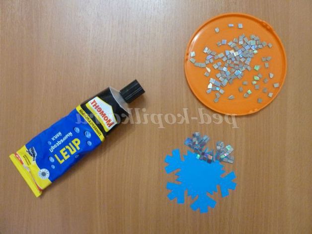 3.На трафарет «сніжинки» нанесемо клей (клей-гель висихає швидко, тому потрібно наносити на невелику ділянку трафарету) і відразу викладаємо шматочки «дзеркальної мозаїки» з CD диска.