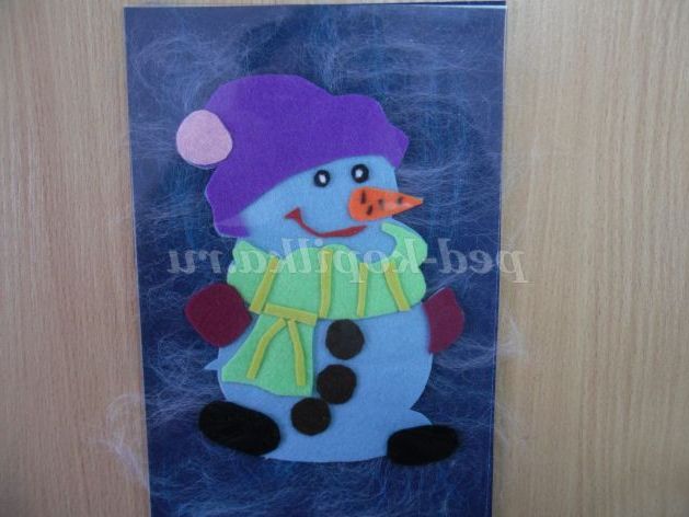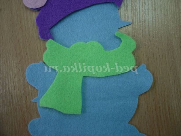 Прикладаємо частини сніговика до листів фетру і вирізаємо їх по контуру, після чого поетапно накладаємо на тіло сніговика.