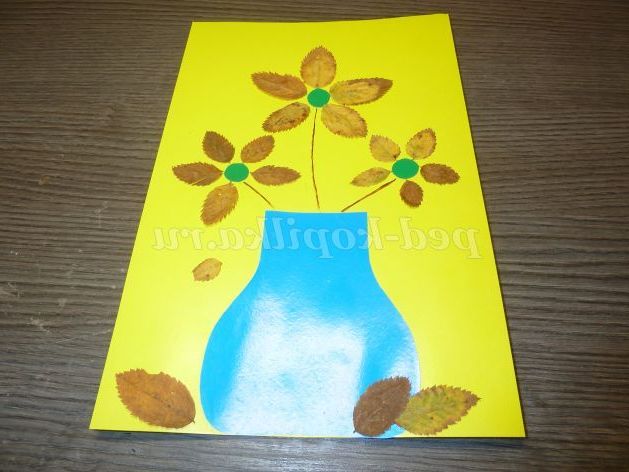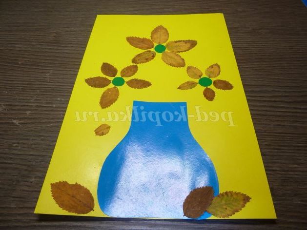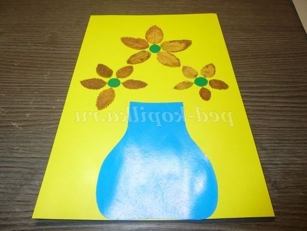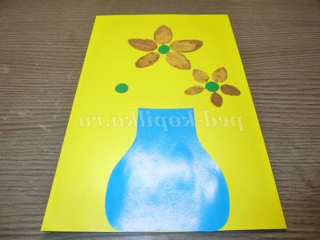 Обладнання: кольоровий картон (жовтий, зелений, синій), шаблон вази, гурток для середини квітів, олівці, клей ПВА, ножиці, листя.