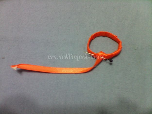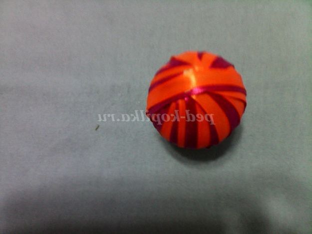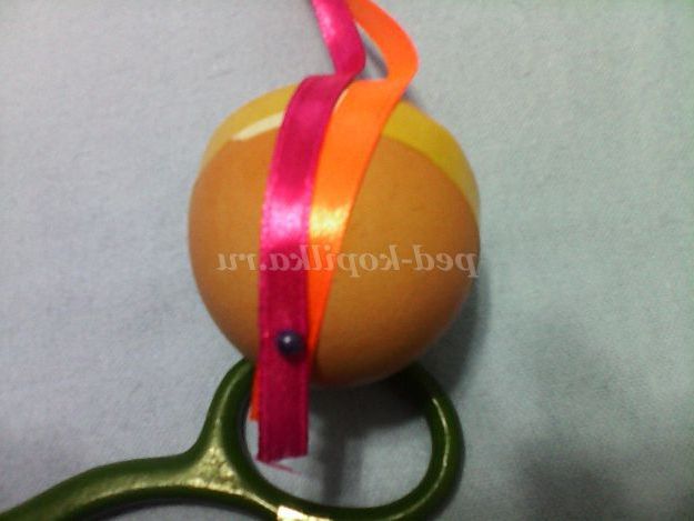 Беремо атласну стрічку і починаємо обмотувати яйцо.Закрепите кінчик стрічки пластиром або голкою і намотайте рівномірно стрічку на всю поверхню яйця.