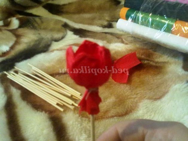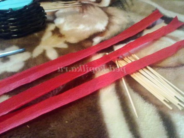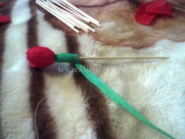 7.Из зеленої гофрованого паперу нарізаємо тонкі смужки, на край смужки приклеюємо двосторонній скотч, і обмотуємо основу і стебло - шпажку.