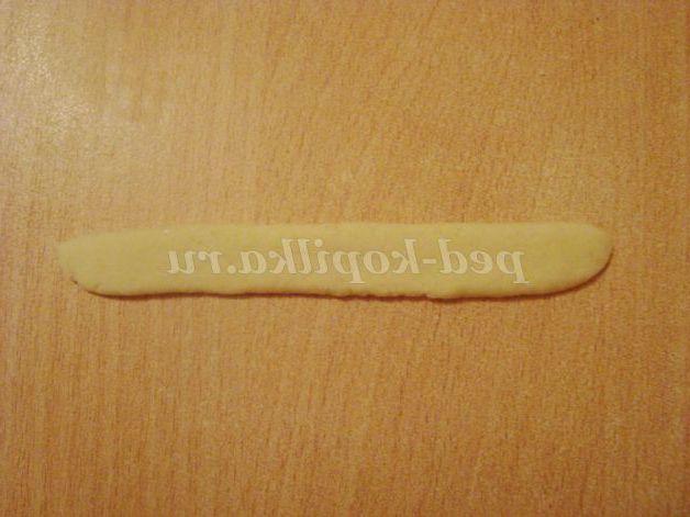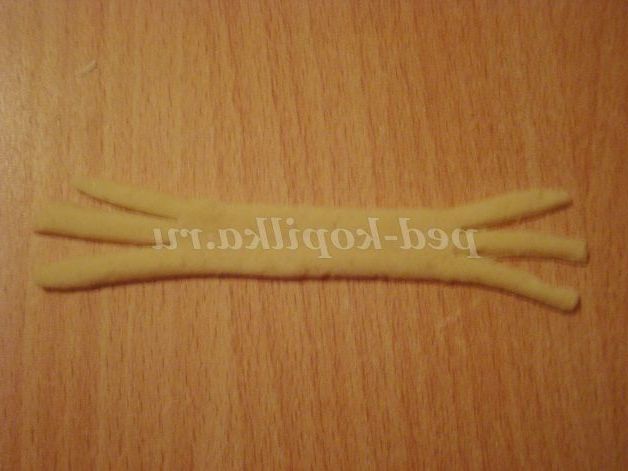 Для волосся розкачуємо ковбаску, розплющуємо і робимо надрізи з двох сторін.