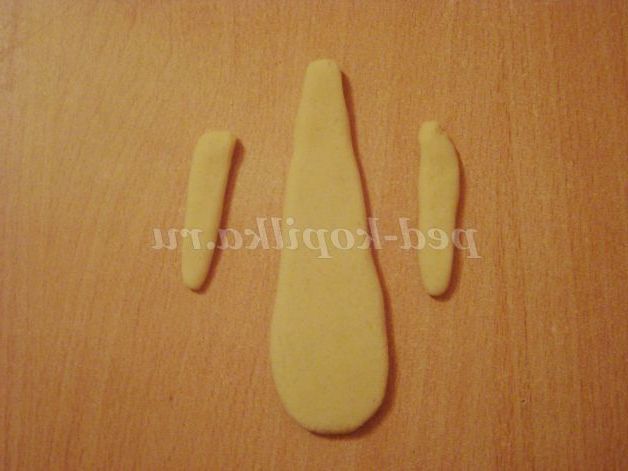 Спочатку робимо тулуб і руки. Для тулуба катаємо деталь у вигляді морквини і розплющуємо пальцями. Руки - ковбаски, теж розплющити.