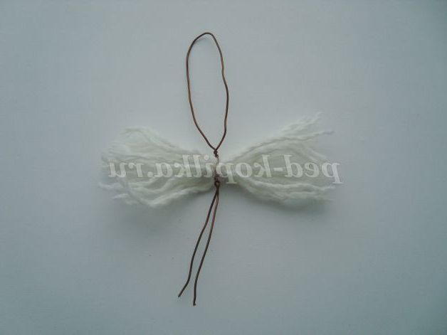 Для волосся наріжте нитки довжиною 11-12 див. Складіть їх разом. Помістіть нижче петлі і закріпіть нитки, закрутивши дріт.