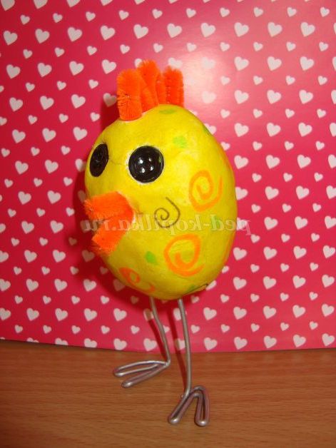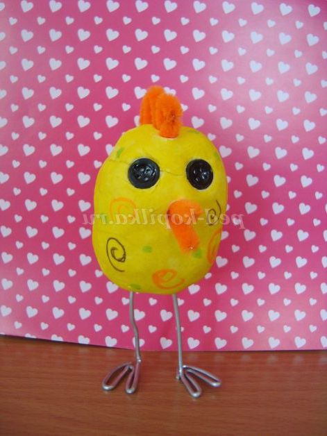 З дроту з ворсом, робимо дзьоб і гребінець, встромляємо в тісто. Гребінець можна зробити з пір'їнок, а дзьоб з картону.