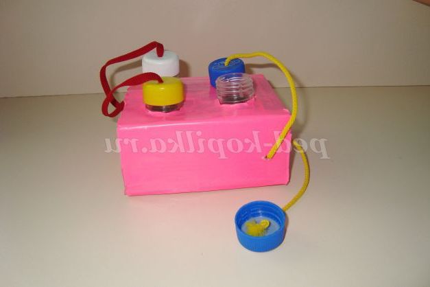 Підберіть міцну коробку потрібного вам розміру. Відріжте верхню частину пляшки (шийка) висотою рівною висоті коробки. Проробіть отвори в коробці для шийок пляшок, так, щоб вони вкручувалися, а не просто вставлялися, так з'єднання буде більш міцним. Підберіть яскраві кришечки, зробіть гарячим шилом отвори в кришках, протягніть шнурок, закріпіть вузликом. Просуньте ремінець крізь коробку і з іншого боку, таким же способом прикріпіть другу кришку. Кількість шийок і кришок залежить від розміру коробки і вашого бажання.