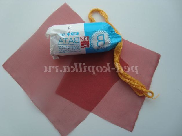 На середину великого квадрата покласти грудочку вати для голови. Обв'язати ниткою, для роботи потрібно нитка 30 см, нитка не обрізати тому весь ангел робиться однією ниткою (крім пензлів і обідка).