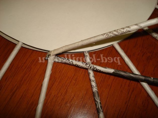 Дві трубочки вставляємо одна в іншу, згинаємо навпіл, заводимо під трубочку і починаємо плетіння, по черзі обвиваючи кожен «промінчик сонечка», це і є плетіння мотузочком