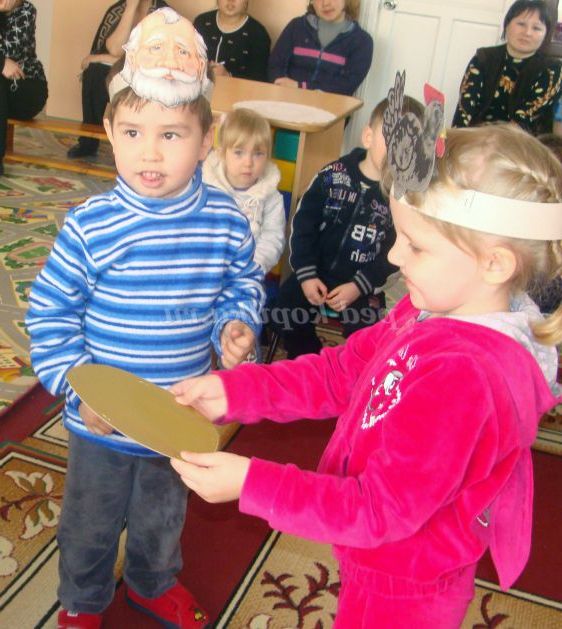 1) Казка « Курочка Ряба». (Я читаю казку, діти в масках зображують героїв).