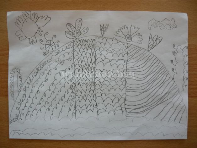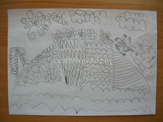 Завдання: Вчити дітей виконувати малюнок, використовуючи різні лінії. Допомогти запам'ятати їх назва (пряма, ламана, хвиляста, "завитки", "петельки", горбки"). В ігровій формі тренувати дітей у малюванні простим олівцем. Розвивати фантазію, окомір, почуття ритму і композиції, дрібну моторику і координацію рухів руки. Виховувати самостійність, акуратність і дбайливе ставлення до своїх малюнків.
