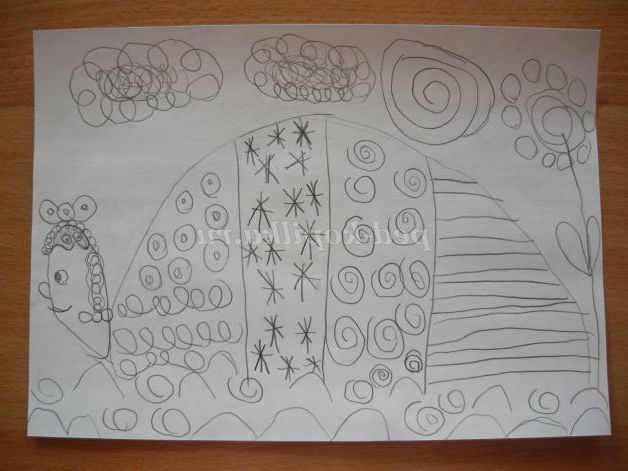 "Черепашка гуляє" Ще один варіант рисунка простим олівцем з використання різних ліній.