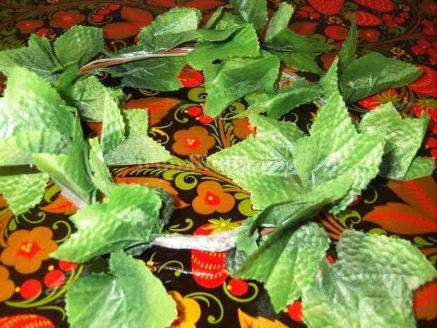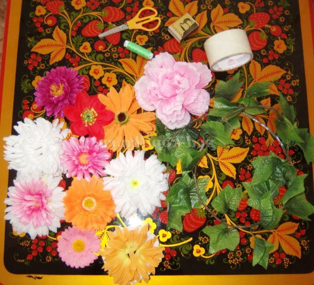 Необхідні матеріали: штучні квіти різних відтінків і розмірів (біля 10 штук), сірники, ножиці, скотч, нитки, голка, штучна ліана з виноградними або будь-якими іншими листям, довжиною в 2 окружності голови дитини.