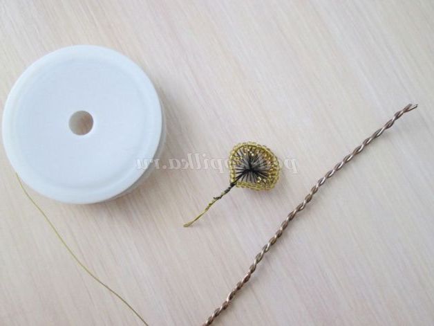 Можна додатково зробити чашолистки з дроту і бісеру без нитки і закріпити їх так, як показано на фотографії.