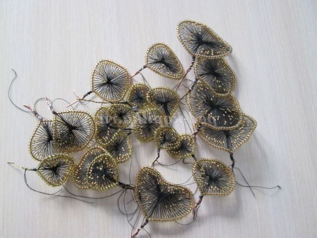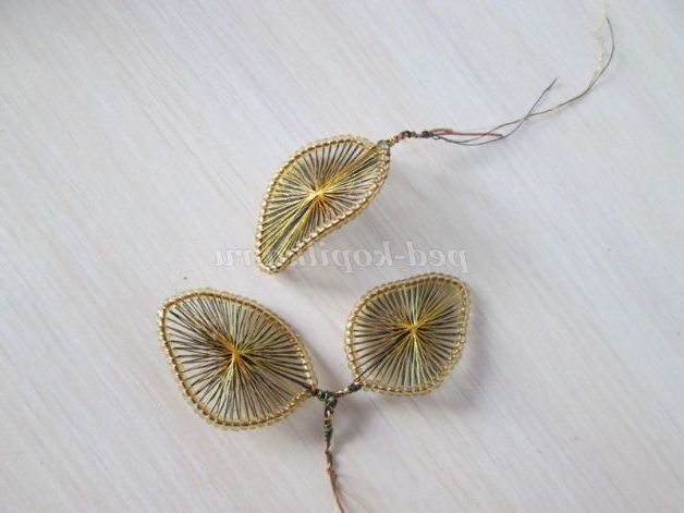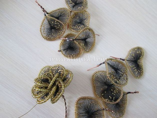 Для листочків наберемо бісер на дріт 0,8 мм. по 56 штук для кожного. Обмотаємо пелюстки спочатку чорної, а потім золотою ниткою.