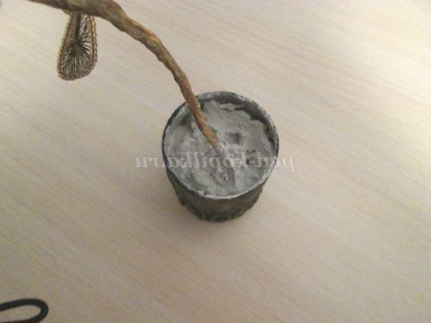 Потім заллємо баночку розведеним водою гіпсом і закріпимо стебло квітки.