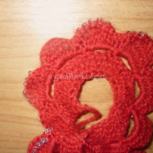 Таку брошку можна пов'язати і з тонких ниток (наприклад, «Ірис»),доповнивши нею річний наряд! Нанизати бісер на нитку в тому випадку, якщо ви не знайшли відповідну голку (в яку пройде бісер) або працюєте з тонкою ниткою можна наступним способом: просмикнути швейну нитку в голку для бісеру і зав'язати, щоб утворилася петелька. У цю петлю ми як у вушко голки вденем пряжу. Нанизуючи бісер на голку, протягуйте його спочатку на швейну нитку, а потім на пряжу.