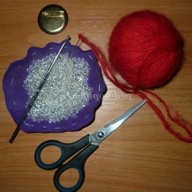Інструменти і матеріали: пряжа «Ангора» (приблизно 20 гр.), бісер великий, основа для брошки, голка з великим вушком (підходить голка для гобелена), гачок №3, ножиці.
