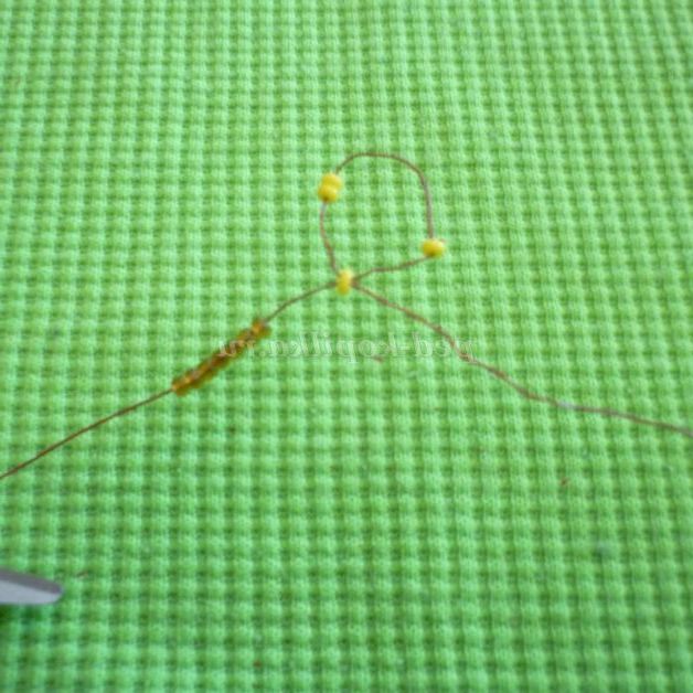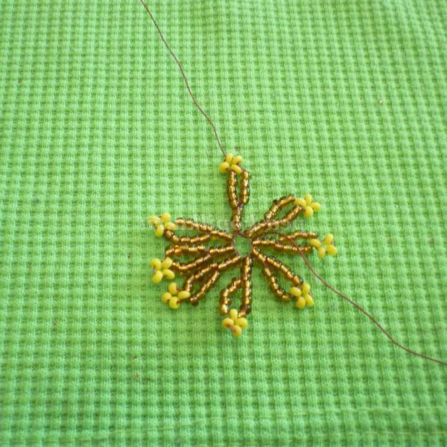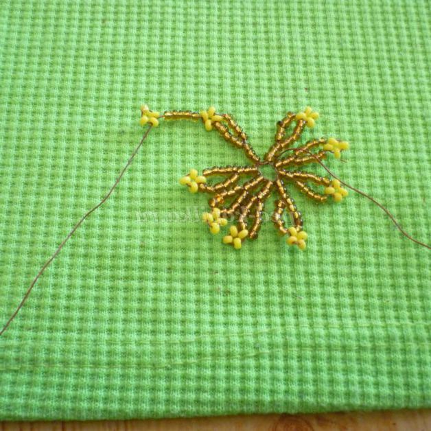 2.Наберите ще п'ять золотистих бісерін і проведіть дріт через 3 золотистих бісеріни третю, другу і першу. Підтягніть дріт.