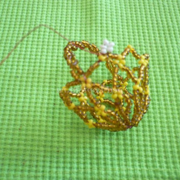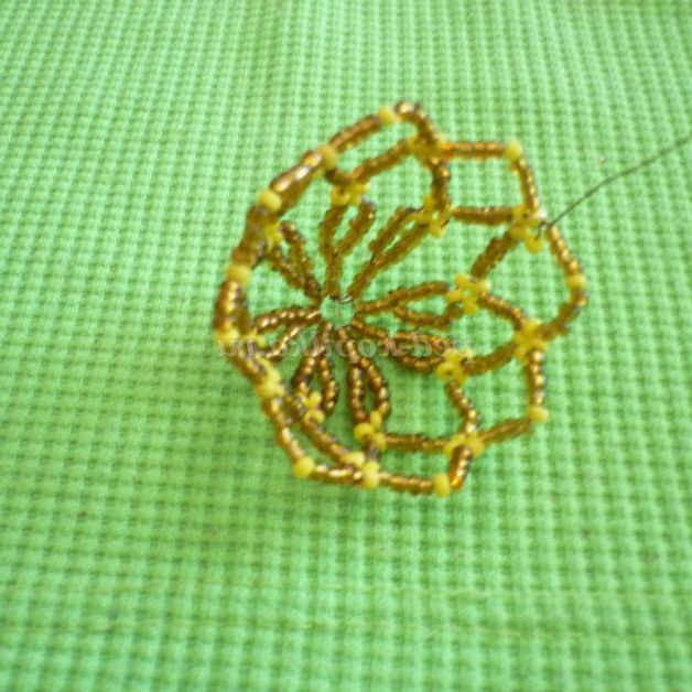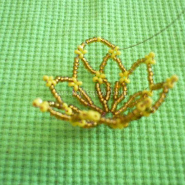 7.Начинаем плести другий ряд кошики. Одягніть 5 бісерін золотистого кольору і 4 жовтого. Пройдіть в першу бісерину з 4-х.подтяните дріт.