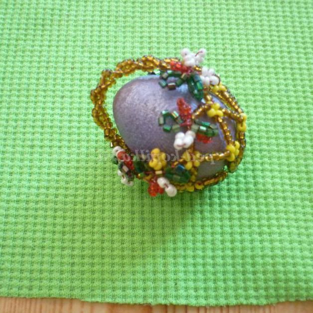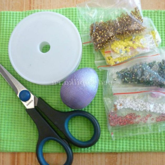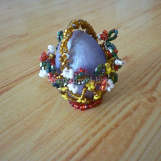 19.Яйцо в кошичку можна використовувати як для великоднього букета, так і як окремий сувенір. Для того, щоб додати стійкість кошичку сплетіть підставку у вигляді кільця з 15 великих бісеринок.