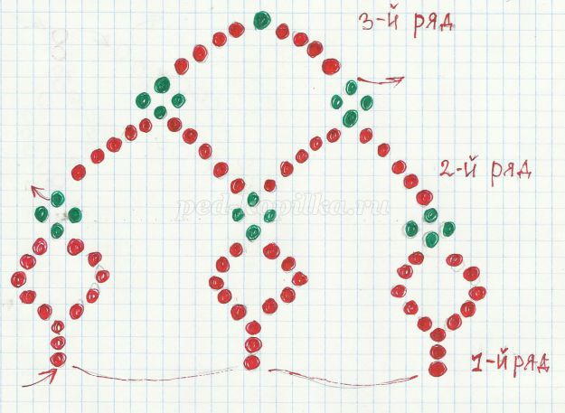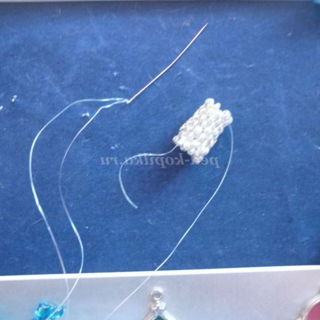 попереднього ряду, при цьому одну ви пропускаєте. Пройдіть так весь ряд. Стягніть волосінь і через бісеринки виведіть волосінь до основи.