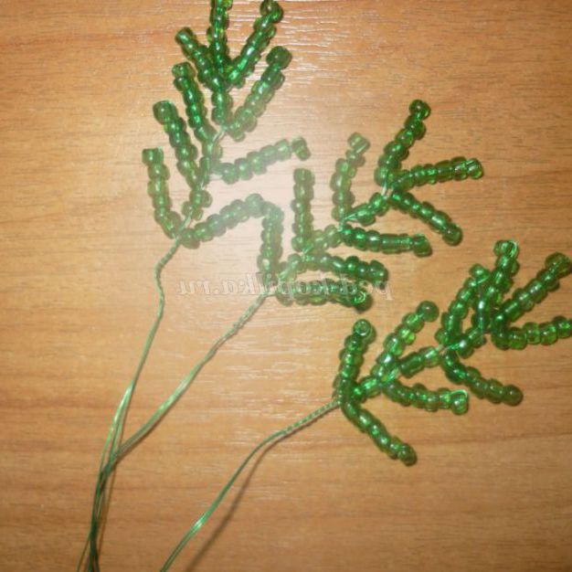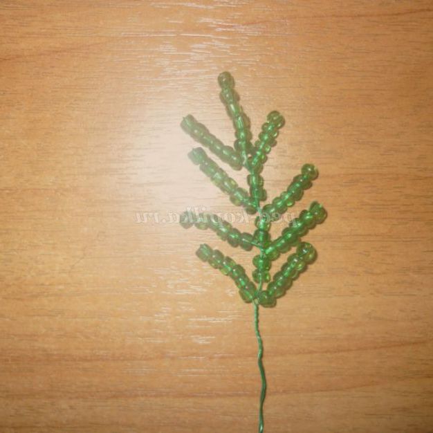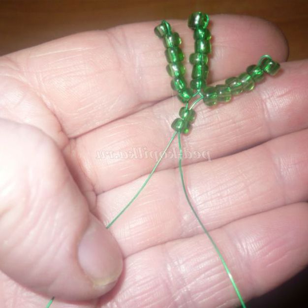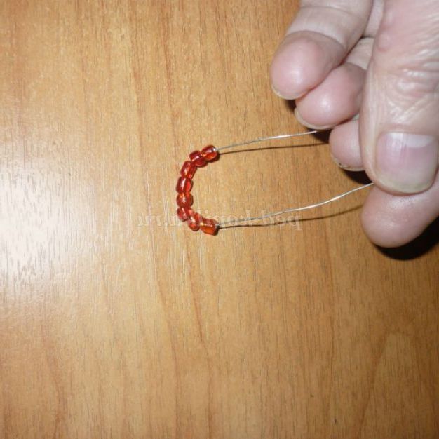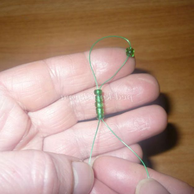 1.Отрезать шматочок дроту довжиною 60см.(бажано зеленого кольору. Одягнути шість бісеринок, пройти через п'ять у зворотному напрямку,