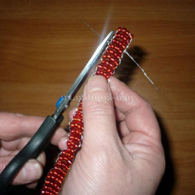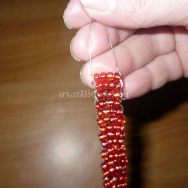 10.Продолжаем плетіння смужки в дзеркальному відображенні: три ряди по три бісеринки в кожному, один ряд-дві бісеринки, знову три ряди по три бісеринки, і завершуємо плетіння дванадцятьма рядами по чотири бісеринки в кожному (так само як і починали)