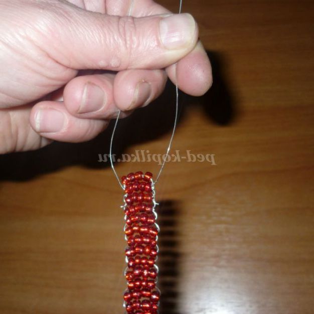 5.Теперь найскладніша частина роботи: потрібно продовжити плетіння 28 рядами по чотири бісеринки в кожному.