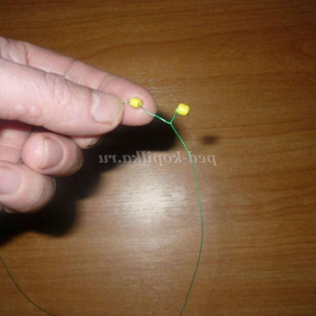 4.Теперь обидва кінці дроту пропустити через дві бісеринки, підтягнути